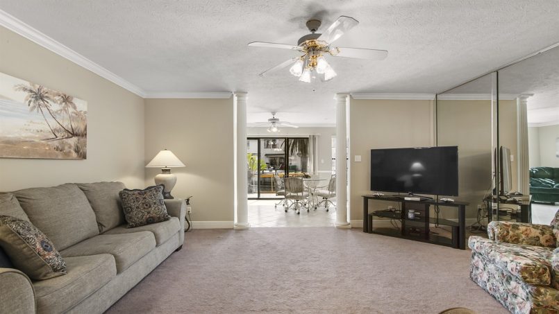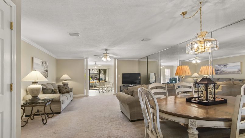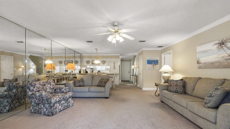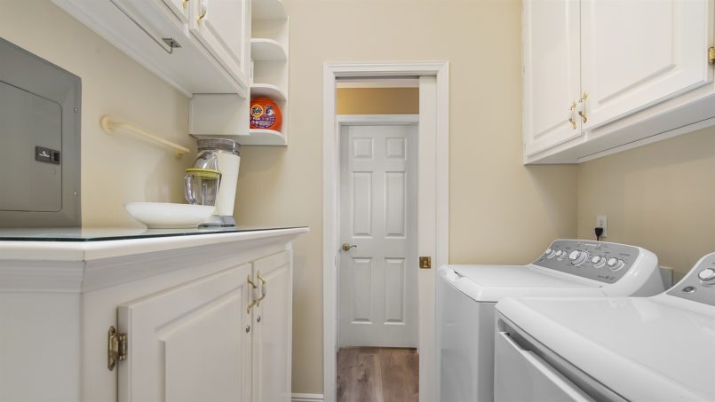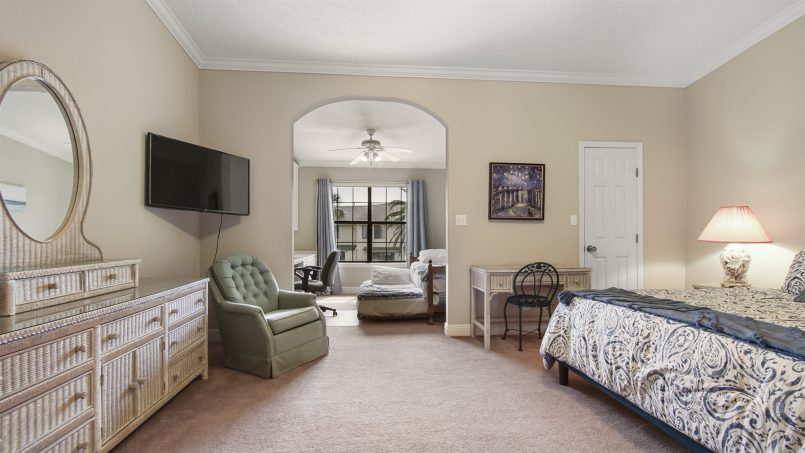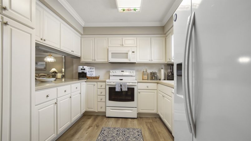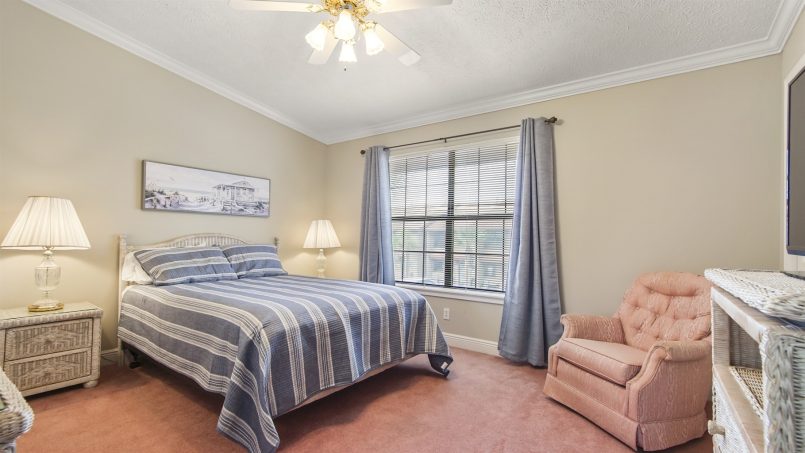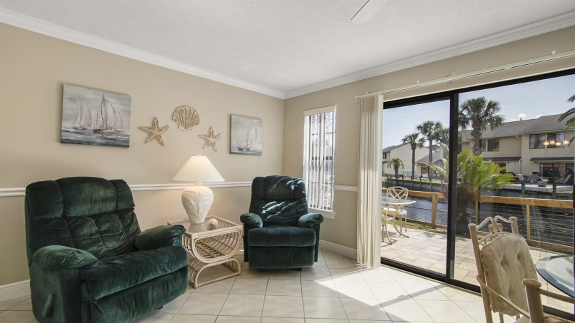 You’ll love the spaciousness of this gorgeous two-level townhome plus the convenience of no elevators and park-at-the-door, dedicated parking spaces. Inside, our downstairs offers a living area with comfortable seating, a smart TV, a half bath, and a well-equipped kitchen with all you need for meals and snacks including a blender, full coffee pot (traditional style), toaster, and crock pot. At the back of the townhome is a sunroom with a table and four chairs for game play, doing puzzles, or eating, plus two lazy chairs for reading and relaxing, and a murphy bed that sleeps two. Continue outside to our large bricked patio with a table and chairs. It’s surrounded by a deck railing system overlooking the adjacent canal water feature.