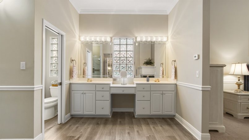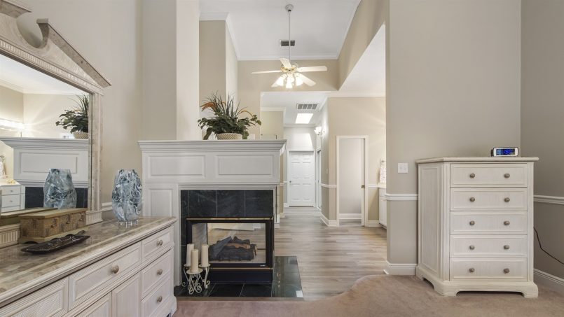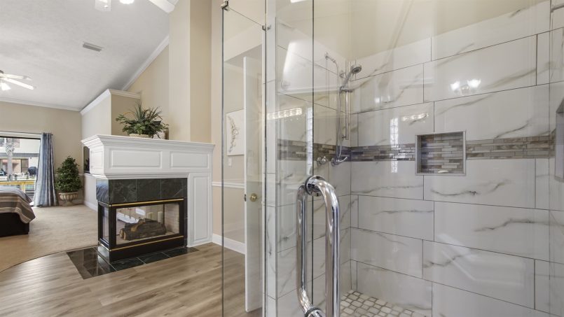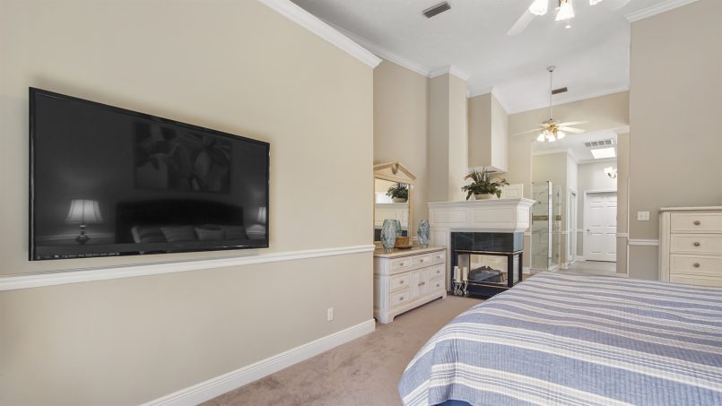 Also downstairs at Bucky’s Beach Too is the main suite with vaulted ceilings, a king bed, smart TV, large walk-in closet, gas fireplace, and ceiling fan. A sitting area offers space to read and relax, and you can step out the sliding glass doors to the patio overlooking the canal. The ensuite bathroom has a glass gas fireplace nestled between the dual vanity, private toilet, and large glass shower.