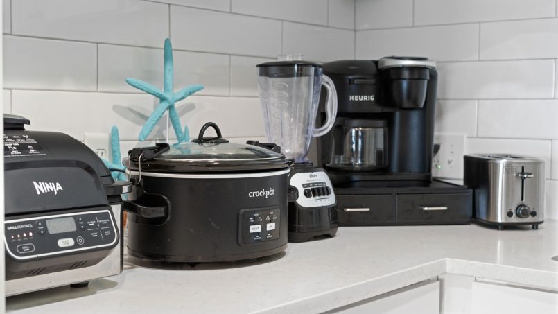 The kitchen comes fully stocked with all the necessities plus more! Dual function Keurig coffee maker for either drip coffee or pods, crockpot, hand mixer, toaster, blender , Ninja grill/air fryer, wide assortment of glasses, pots, pans, kids dishes, and utensils.