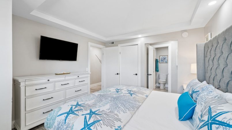 The bedroom offers a king bed, 2 nightstands, dresser and a wall mounted flat screen t.v.