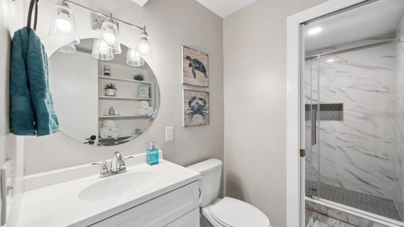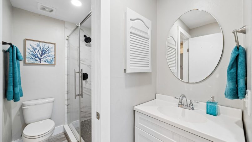 The king bedroom has its own separate vanity, toilet, and a large walk-in shower.