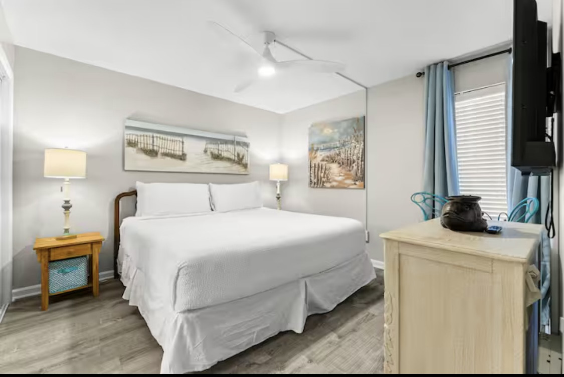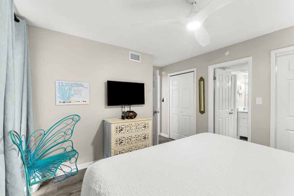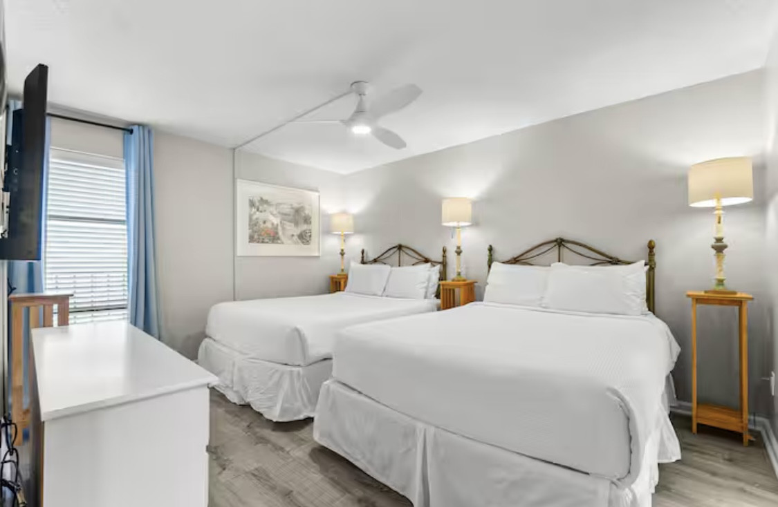 The guest bedroom features two queen-sized bed, smart TV with streaming channels, ceiling fan, clothing storage, and access to the 2nd full bathroom with a tub/shower combo.