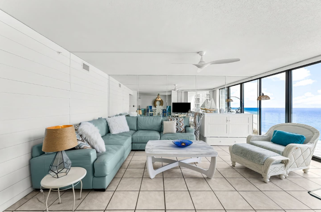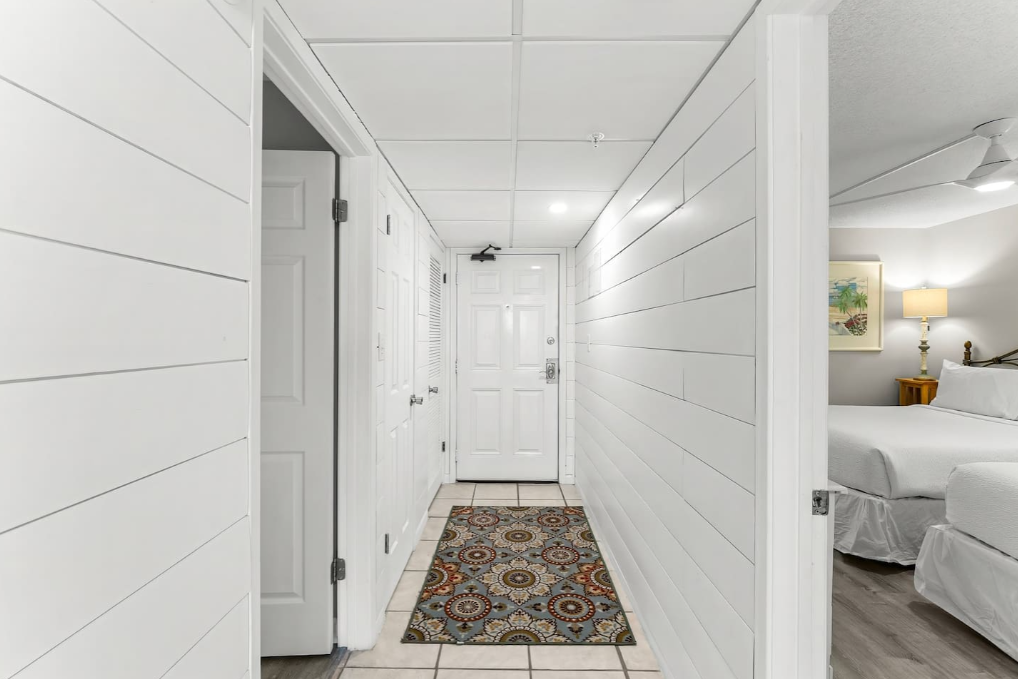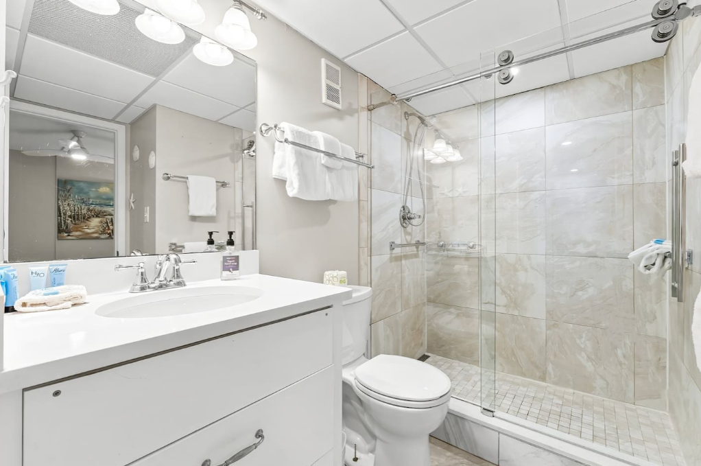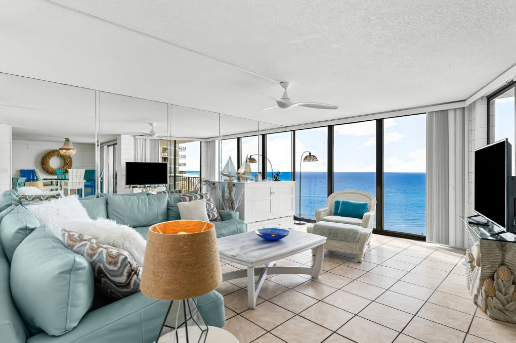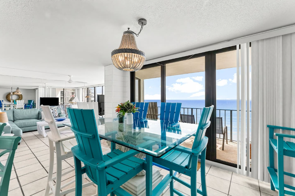 In the main condo area is comfortable seating, a dining area, and a stylish bar looking into the kitchen. A smart TV provides access to all entertainment via apps/streaming channels.