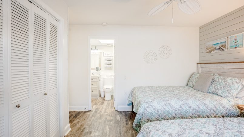 The guest bedroom features a queen-size bed and a full-size bed, flat-screen TV, and access to the 2nd full bathroom.