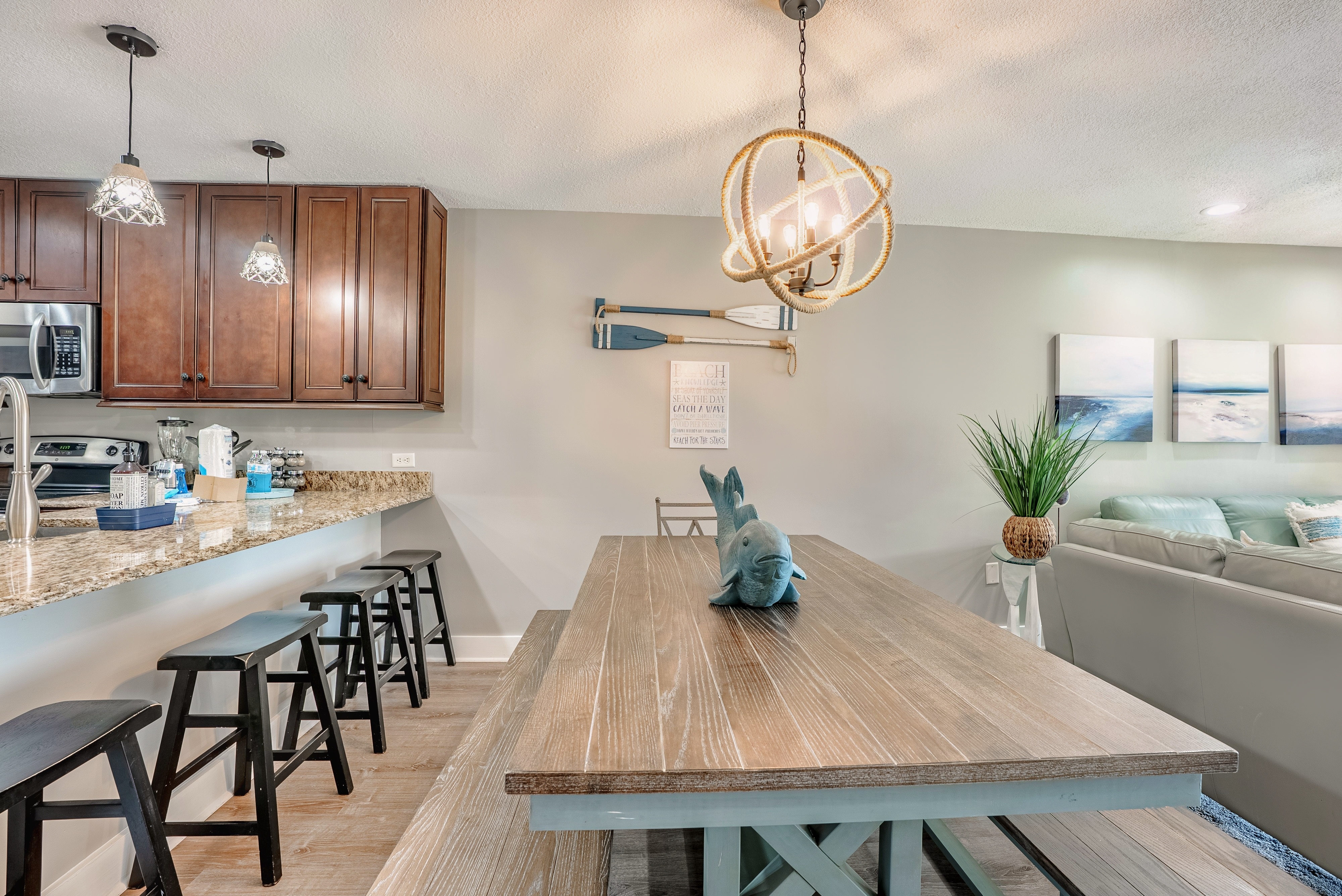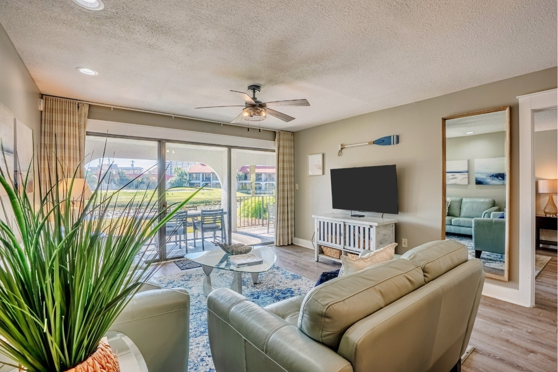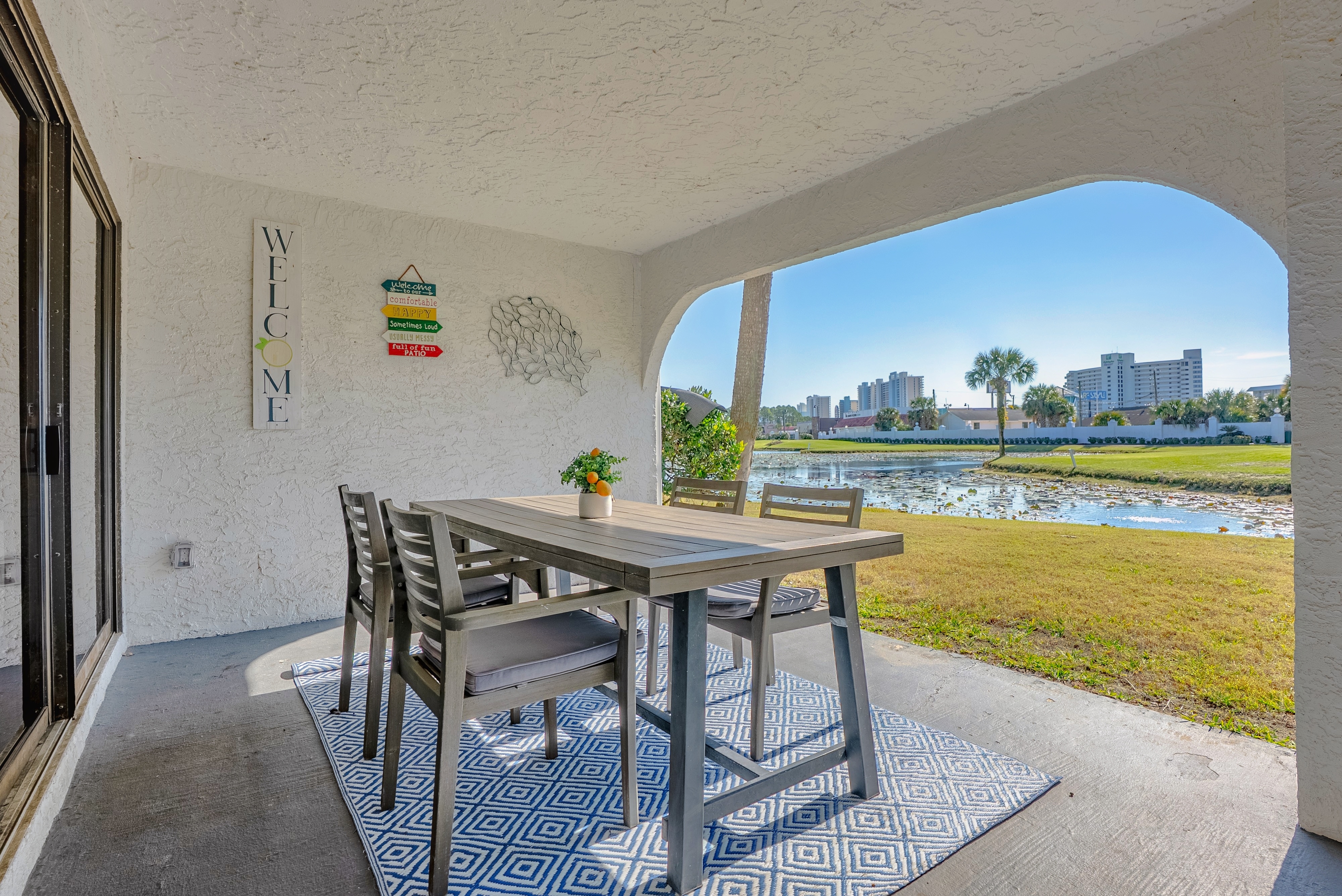 The Tipsy Turtle PCB is a gorgeously decorated and perfectly situated two bedroom, two bath villa for six guests. It’s well-appointed interior features a comfy living area with couches, smart TV, large dining table, fully-equipped kitchen with all appliances (large and small) plus dishes/pots/pans/utensils for all meals, and access to one of the largest covered double patios on property. Enjoy dining al fresco as you look over the pond full of turtles, ducks and water lilies and then beyond to the iconic 8th island green of the Edgewater golf course.