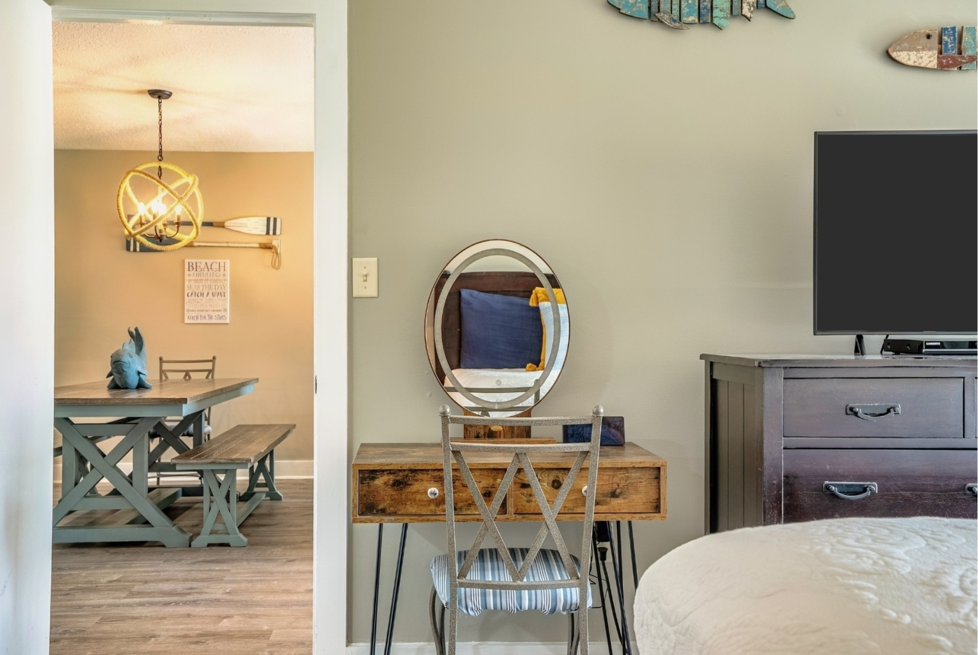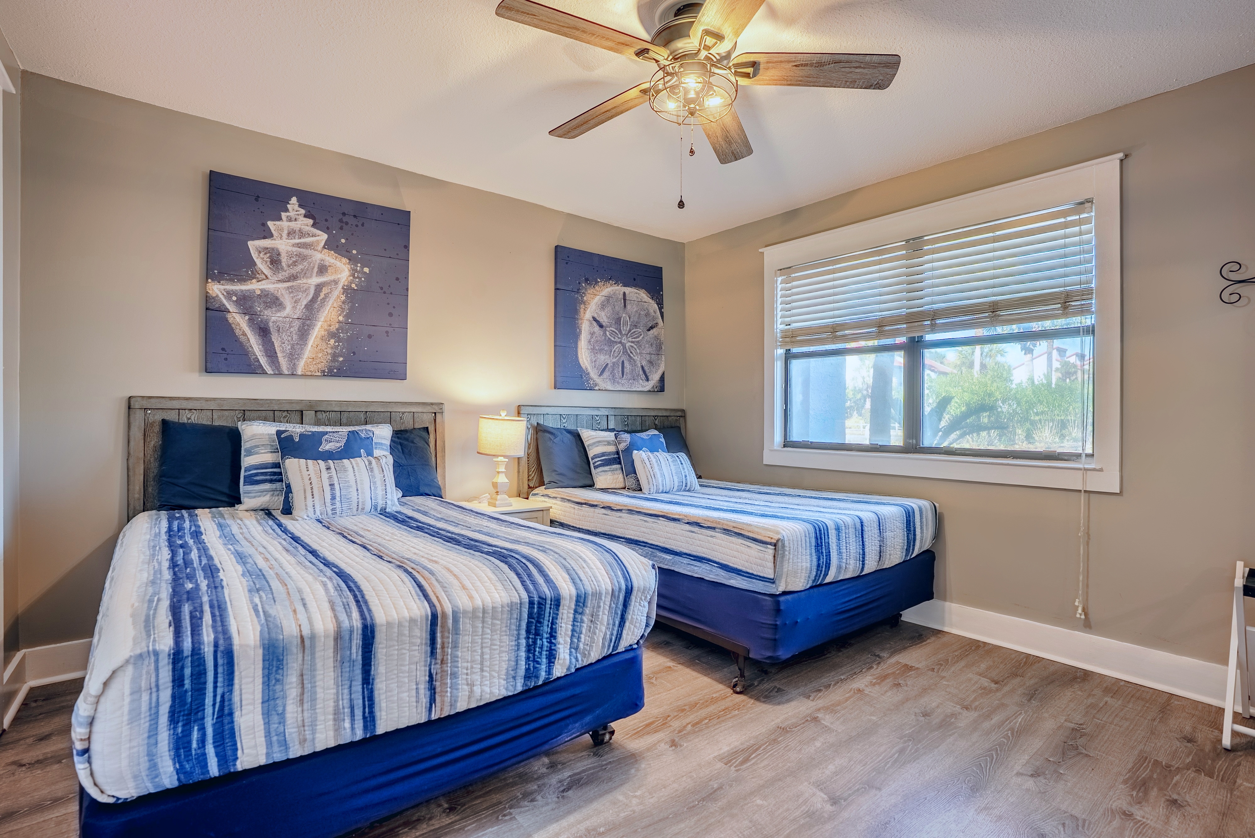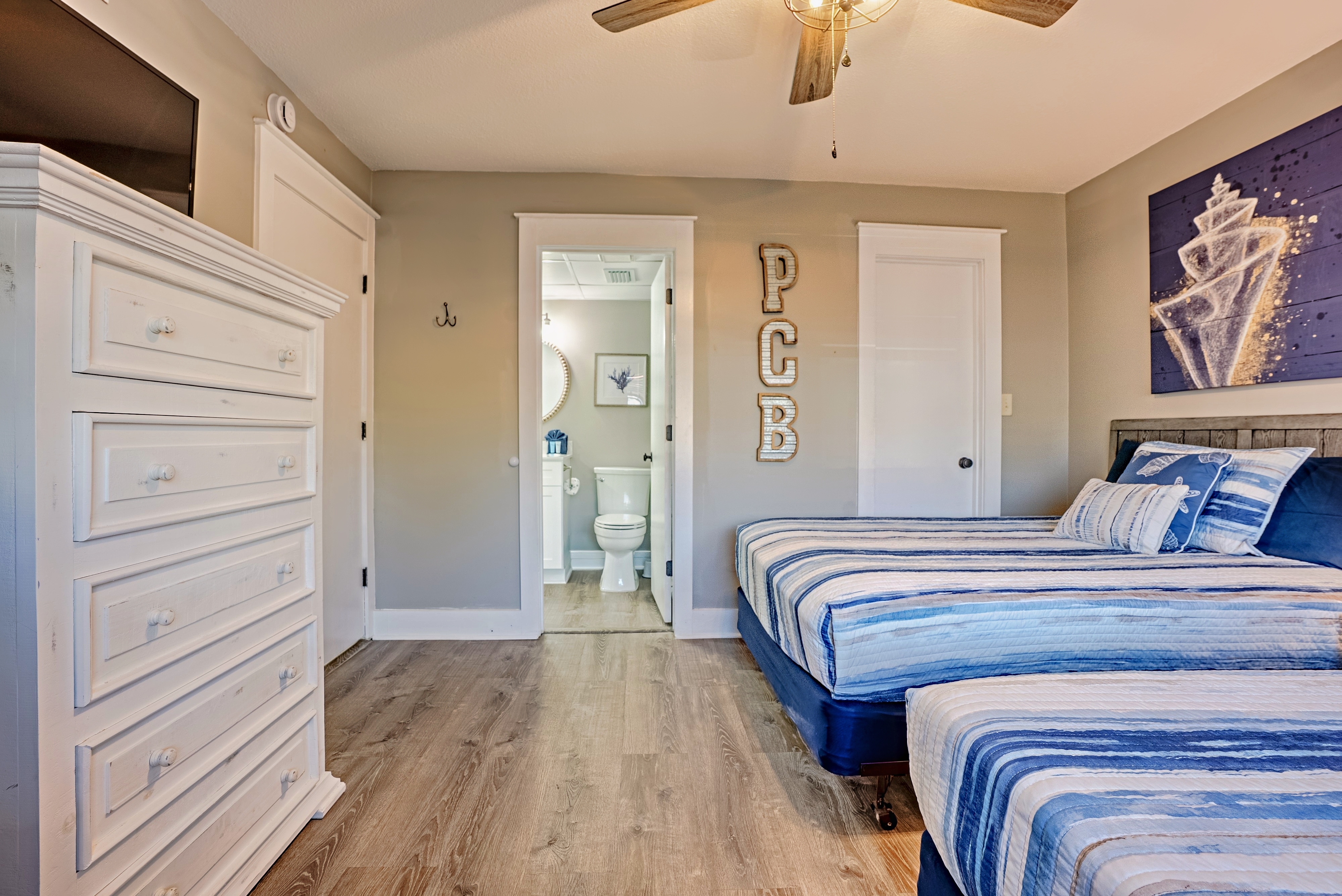 Down the hall is the guest bedroom with two full sized beds, smart TV, and access to the guest bathroom with a vanity and tub/shower combo.