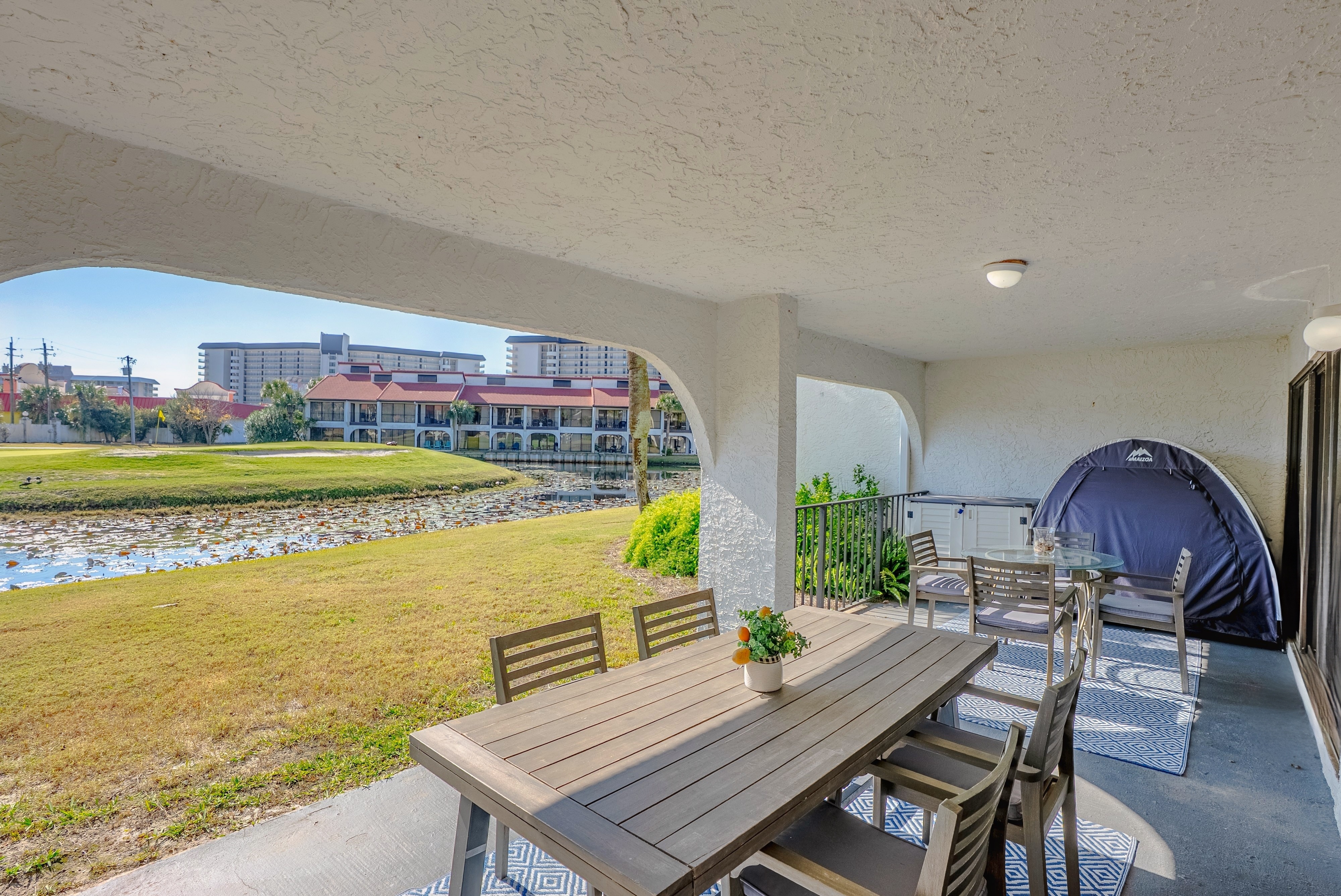 The luxurious Edgewater Beach & Golf Resort is Panama City Beach’s ONLY full-service resort. Just over the resort pedestrian bridge, you’ll find a full restaurant, tiki bar, huge oceanside lagoon pool, kids splash area, Starbucks, market, ice cream parlor, 4 hot tubs, water sports/activities, beach chair service (pool and beach), and more. On our side of the resort is a 9-hole golf course, Pro Shop, fitness center, and basketball/tennis/shuffleboard/pickleball courts.